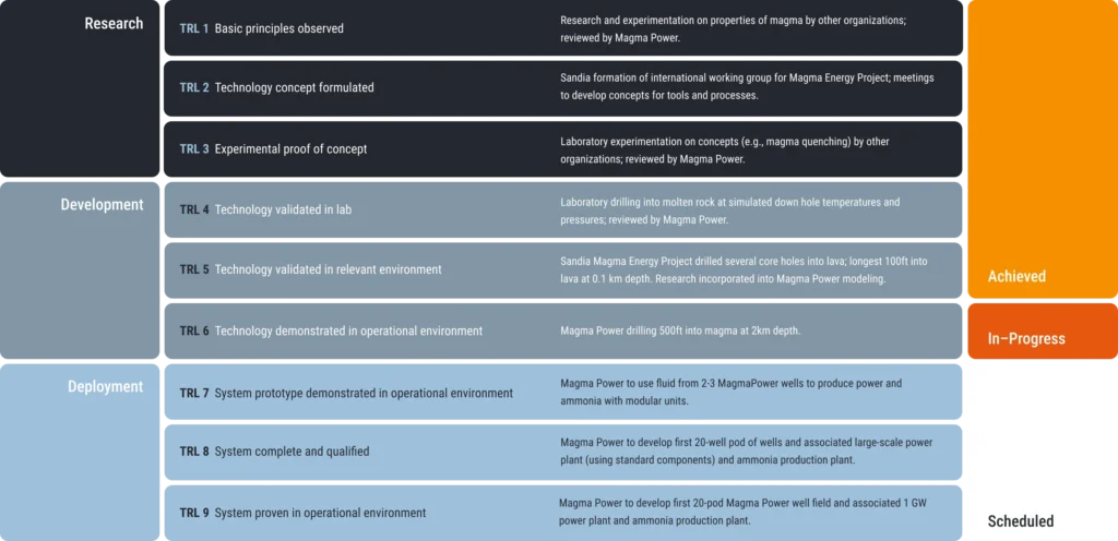 Research and experimentation on the properties of magma (e.g., Massachusetts Institute of Technology, Syracuse University, Ludwig–Maximilians Universitat Munchin) and the potential for energy extraction (e.g., Sandia National Labroratories, The Iceland Deep Drilling Program, the Krafla Magma Testbed participants) have been conducted by various organizations. As outlined in the figure below, this research has advanced the science and technology development through TRL 5.